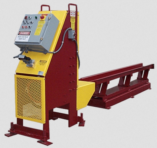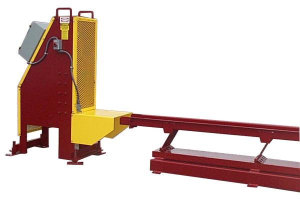 The Mellott Scrap Shear uses a simple low maintenance design to shear long pieces of lumber into short, easily handled lengths.