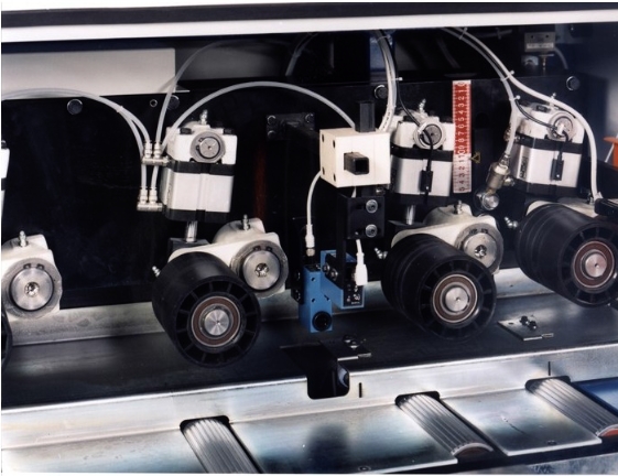 - Pressure rollers, sitting on pneumatic cylinders, allow the feeding of boards with rough surface and sensible variations in thickness