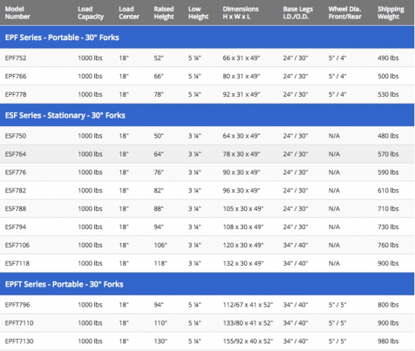- Standard units are equipped with 30" long adjustable solid steel forks. An optional 32" x 30" slip-on platform can be added as seen in the picture