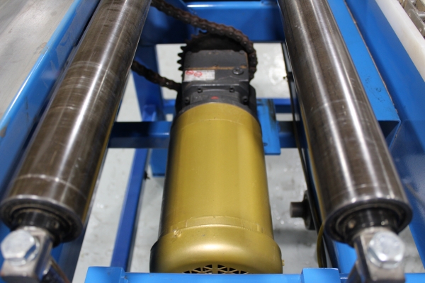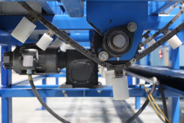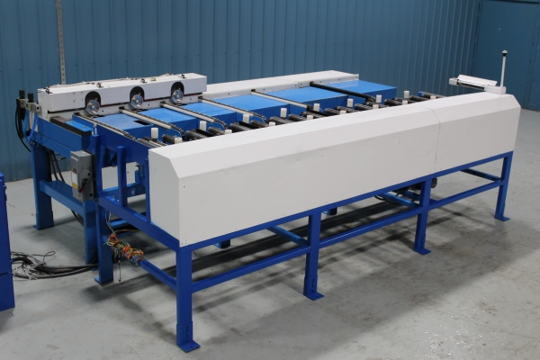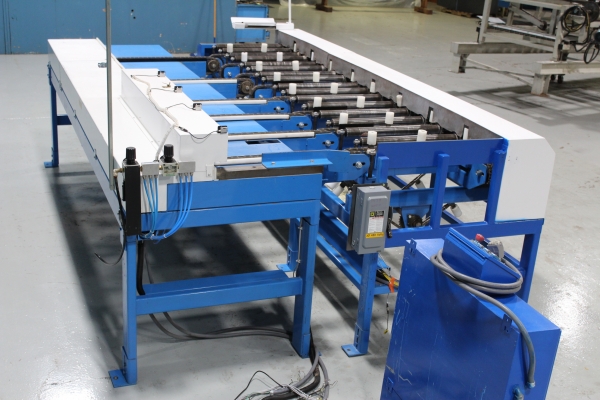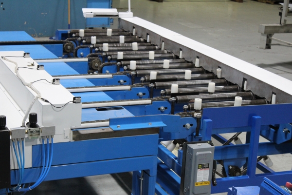 - Take away roll case and 90 degree feeder using a chain driven heavy duty roll case to take lumber from one Machine and a set of sweep chains to side transfer the lumber to the first staging station still on the roll case, and then again to the 90 degree chain deck feeder