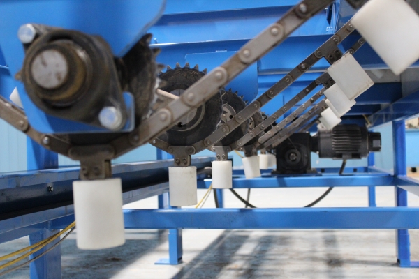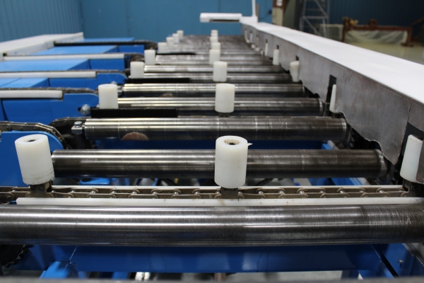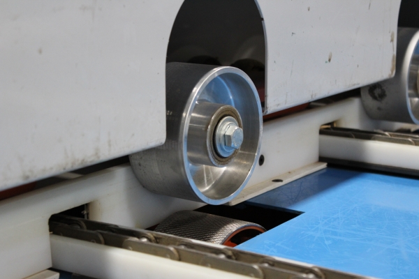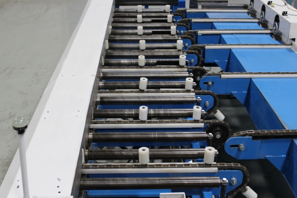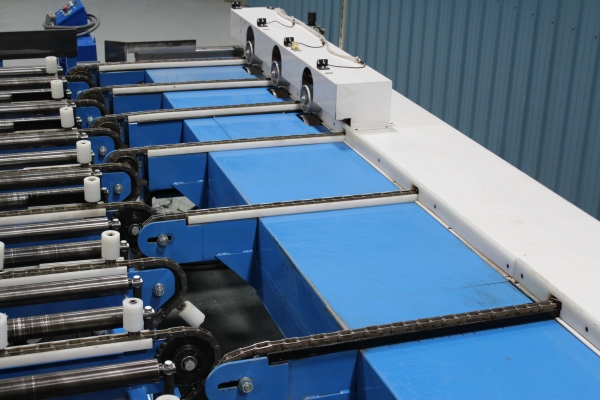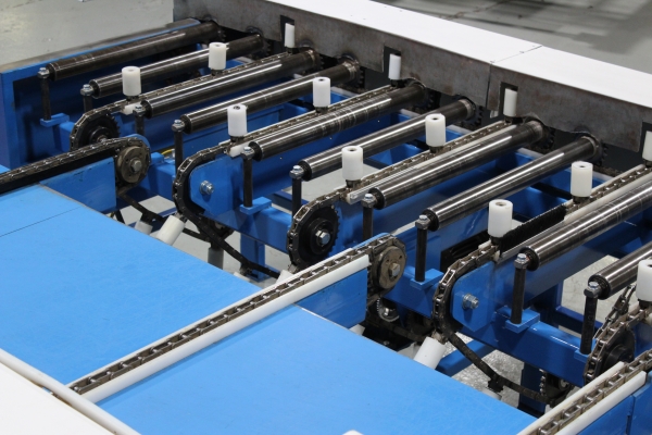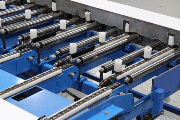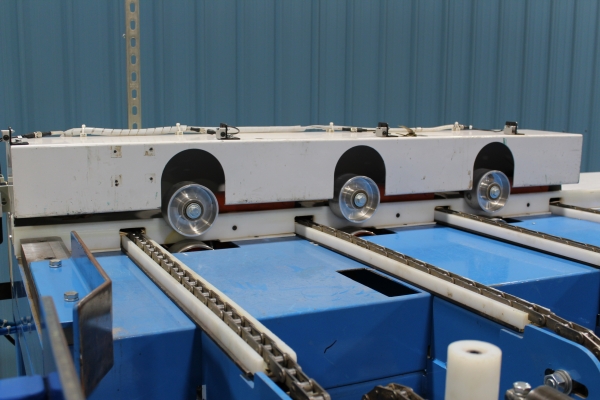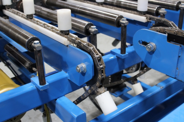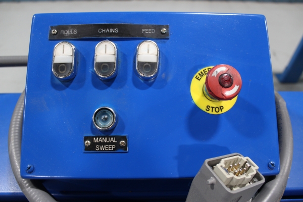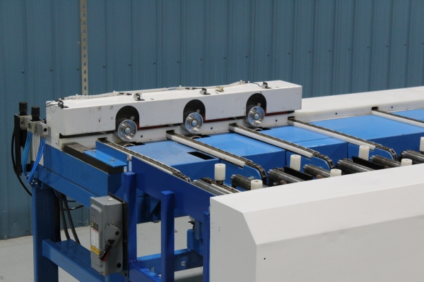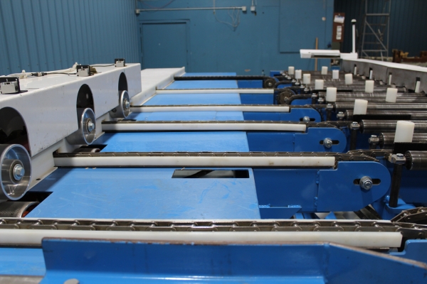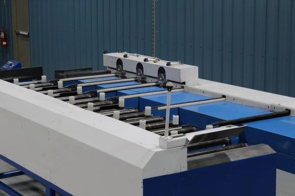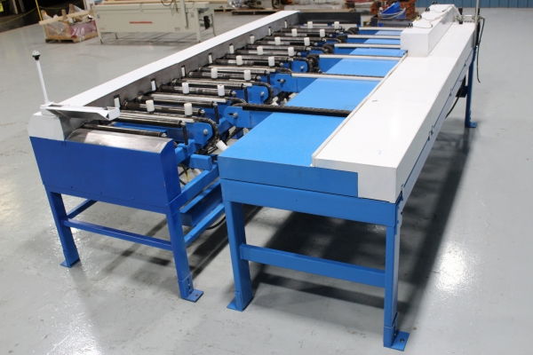 - Once the first sweep has been made, the board will continue on to the far side even end where it will be ready for the next sweep to send it onto the chains. The boards will then travel laterally to the feed fence to be pinch roll fed into second Machine