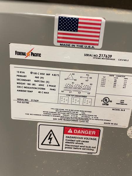 Federal Pacific Cat. # WS-2 460-460Y/266 15kva Transformer