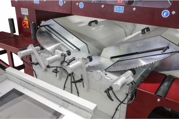 - a heavy duty full automatic double head CNC miter saw equipped with 22" (550 mm) carbide tipped saw blade, and designed for straight and miter cut of aluminum, vinyl profiles and wood.