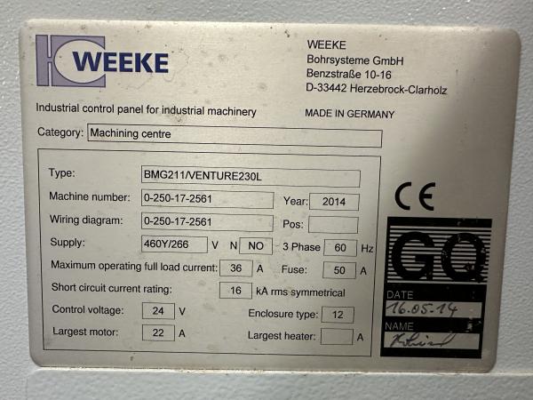 - Notes: This is a super-clean machine. They are only selling because of a move towards full five-axis. Original Weeke Pods will be included with the machine (previous owner is keeping the green BVC pods). They are also keeping the tool holders and aggregate. This machine does have a spindle vibration sensor installed.