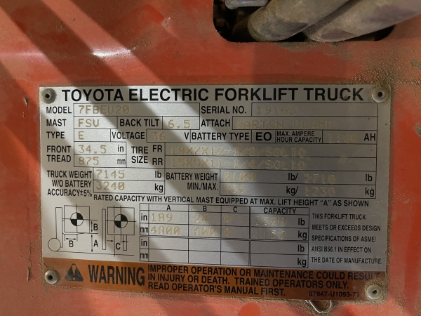 Toyota Model 7FBEU20 Forklift