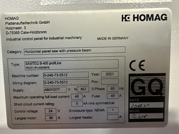 Used- Homag SAWTEQ B-400 ProfiLine HPL 400/38/16 Rear Load Panel Saw