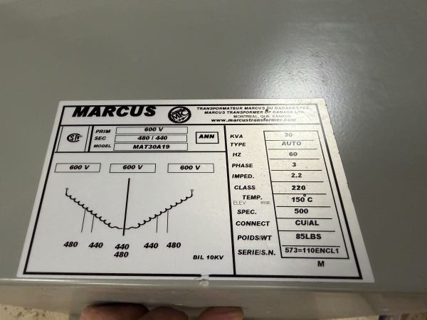- 575v, 3ph (Supplied with Marcus 30 KVA Transformer to 480 Volt